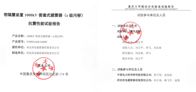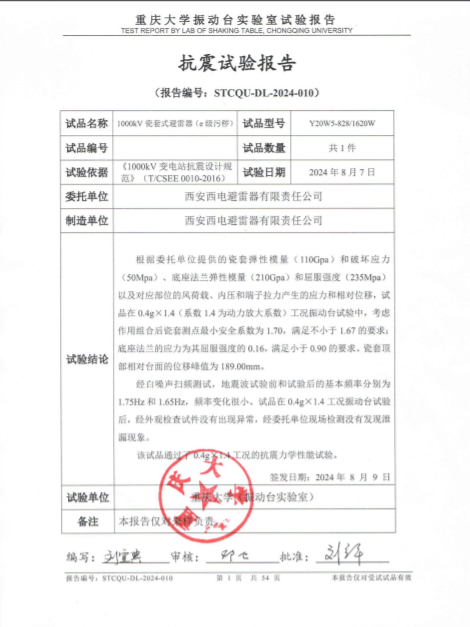 8月8日,西电避雷器研制的1000kV瓷套避雷器(e级污秽)在重庆大学进行了9度抗震试验。试验顺利通过,最小安全系数不小于1.70,满足不小于1.67的要求。此项试验,西电避雷器属国内首家通过试验的制造厂家。这为公司的市场开拓提供坚强的技术支持。